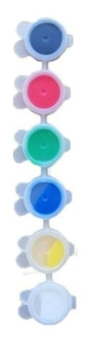 Bu akrilik boya seti, 6 farklı ana renkte 3ml'lik kapaklı boya kabı içermektedir.